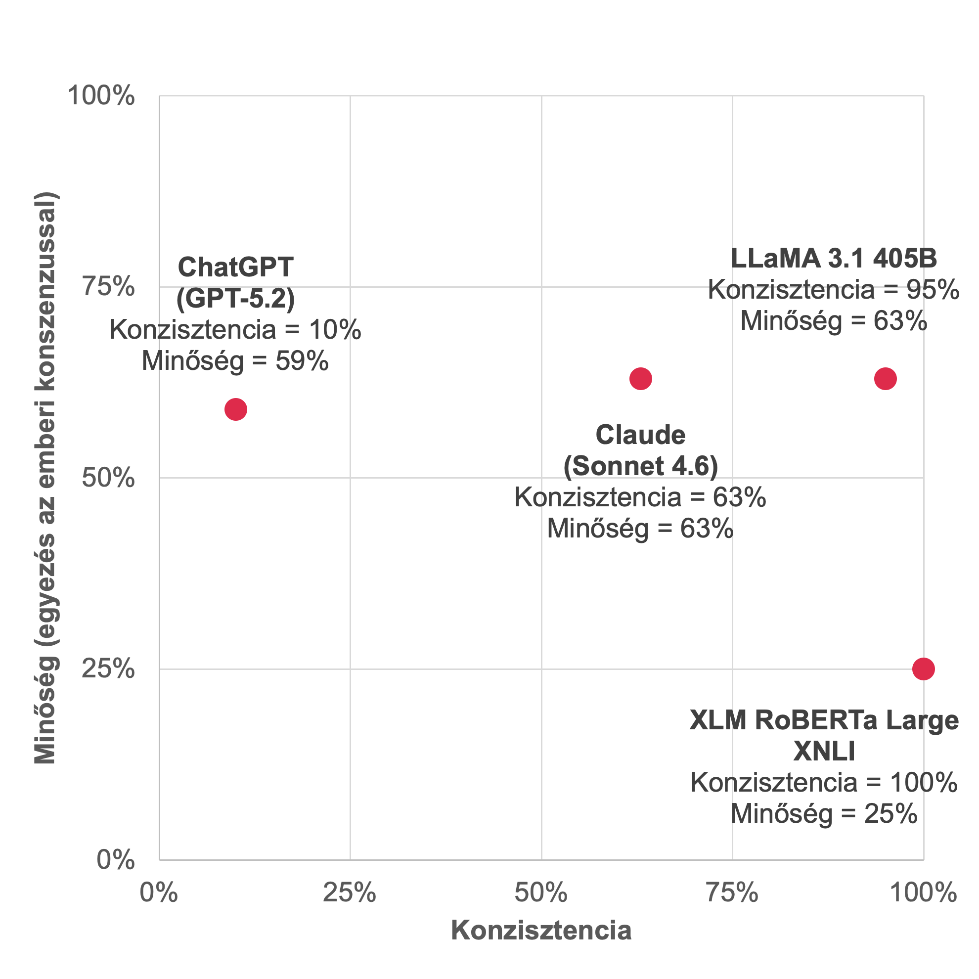 A ChatGPT-nél a tökéletes konzisztencia fals eredményeket takart. Ezzel szemben a RoBERTa úgy volt 100%-ban stabil, hogy az elvárásunknak megfelelően, többféle címkét használt. Ugyanakkor, a RoBERTa megoldását összevetettük az emberi címkézés eredményeivel (ehhez a három személy konszenzusos címkézését használtuk), és a kettő csupán 25%-ban egyezett.