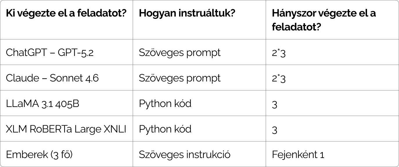 A ChatGPT és a Claude prompt alapján végezte el a címkézési feladatot, a RoBERTa és a LLaMA modelleket az NLP Cloud kategorizációs platformján keresztül használtuk, az emberek pedig írásos instrukciót kaptak.