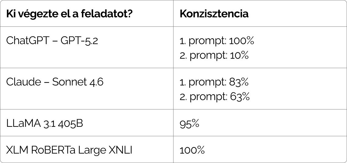 Az eredmények konzisztenciáját nagyban befolyásolja, hogyan futtatjuk és milyen keretek közé szorítjuk a feladatot. A chat-alapú generatív modellek (ChatGPT, Claude) érzékenyebbek az apró megfogalmazásbeli különbségekre, ezért ugyanaz a feladat több futtatásban eltérő címkézést adhat. A LLaMA, bár a ChatGPT és a Claude modelljeihez hasonlóan generatív modell, nálunk strukturált módban (kategorizációs API-n keresztül, kóddal, kötött címkekészlettel) futott, ezért sokkal stabilabb eredményt kaptunk. A RoBERTa a másik három modellhez képest más elven működik, ez kifejezetten osztályozásra optimalizált. És mint ilyen, a 100%-os konzisztencia elvárható ettől a modelltől.