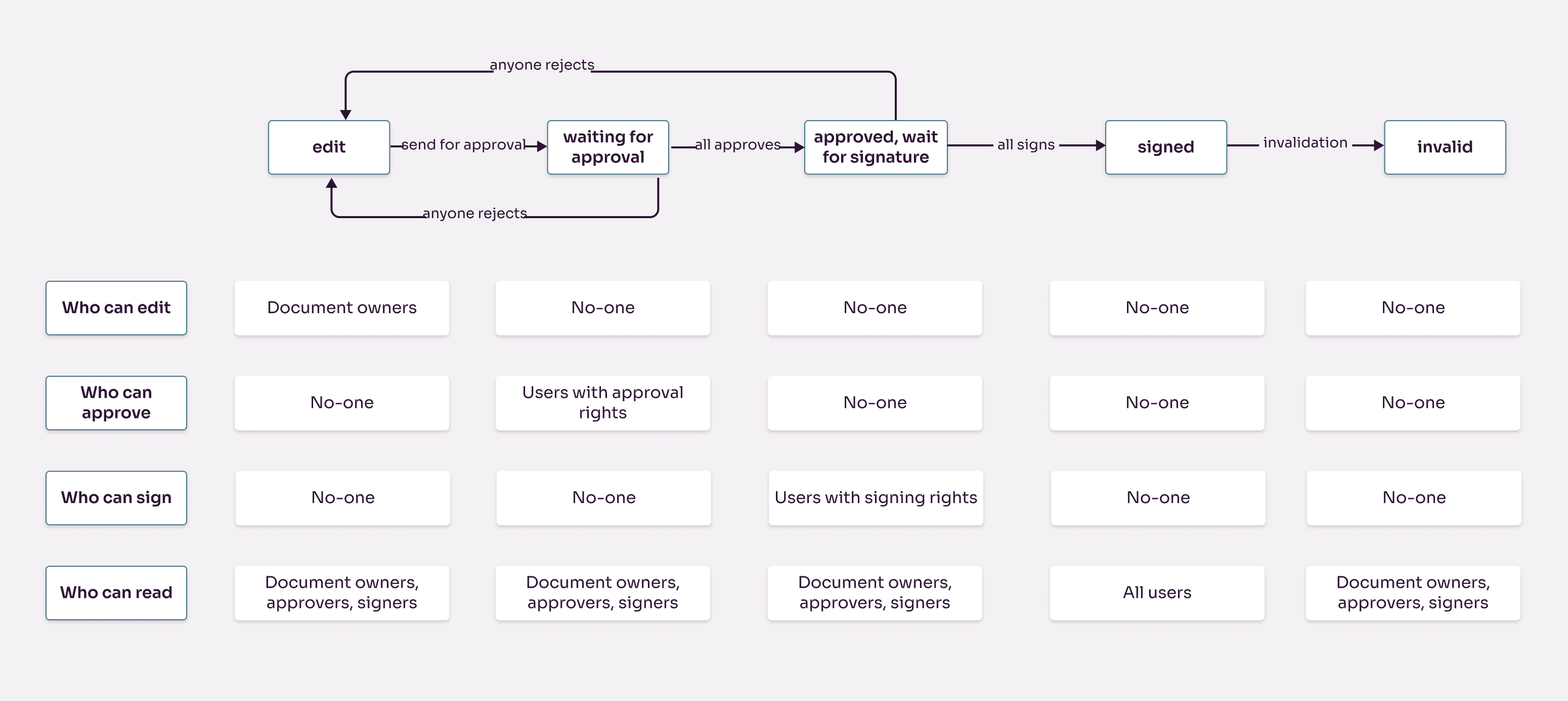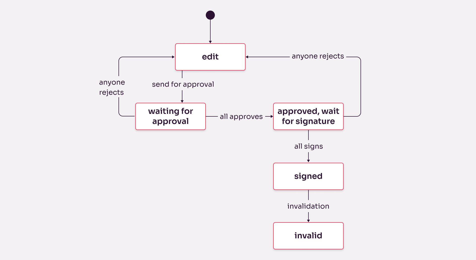 Approved, waiting for signature: When all approvers approved the document, it goes for another managerial level to be signed. Signers can still reject it, then it goes back to editing. Or all signatures are collected, then it moves to signed state.